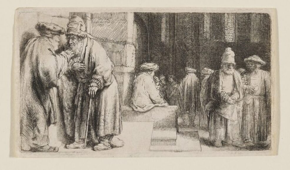 Deze afbeelding is een ets van Rembrandt van Rijn. De mannen in de synagoge dragen traditionele
